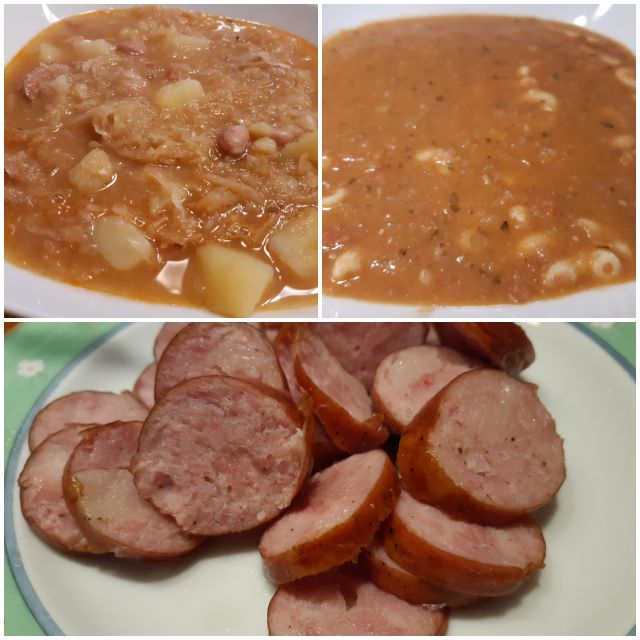 Pri nas danes vsak svoje iz zalog- mož joto s klobaso, sin fižolovo juho s klobaso, jaz kokošjo juho, meso iz juhe, motovilec s fižolom