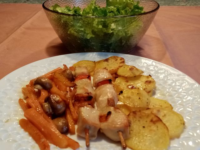 Pečena nabodala s krompirjem, karameliziran korenček in šampinjoni; zelena solata