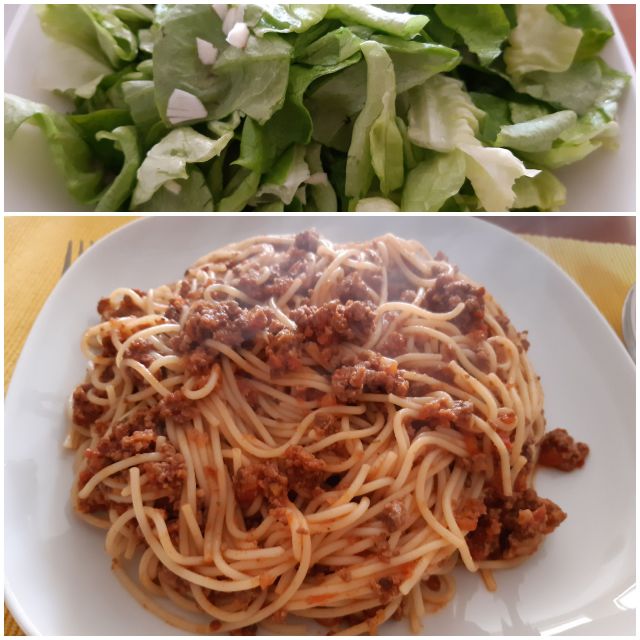 Po dveh dneh pijače iz plastenk , sendvičev in zasilnih izhodov danes doma špageti bolognese in solata.