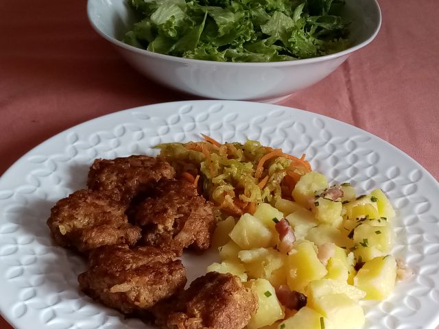 Kitajske čuftice, maslen krompir, korenček in bučka v voku; zelena solata