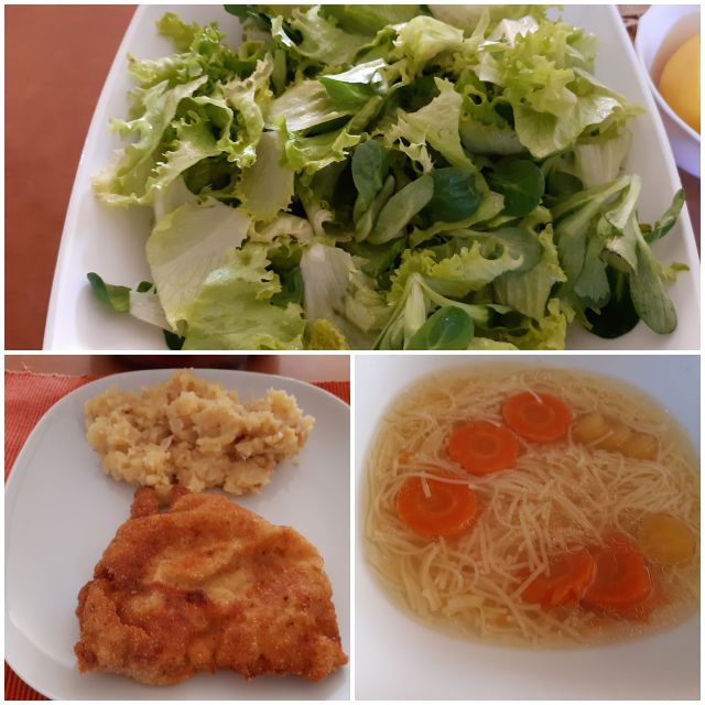 Včeraj goveja juha z rezanci, meso po dunajsko, pražen krompir, solata