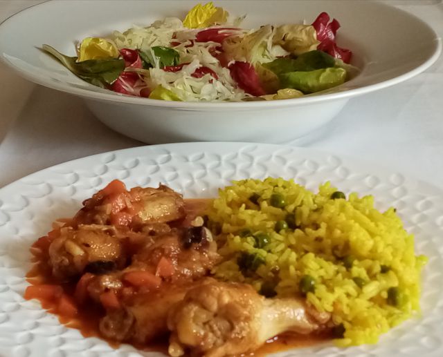 Perutničke v omaki, rizi-bizi s kurkumo; zelje in radič