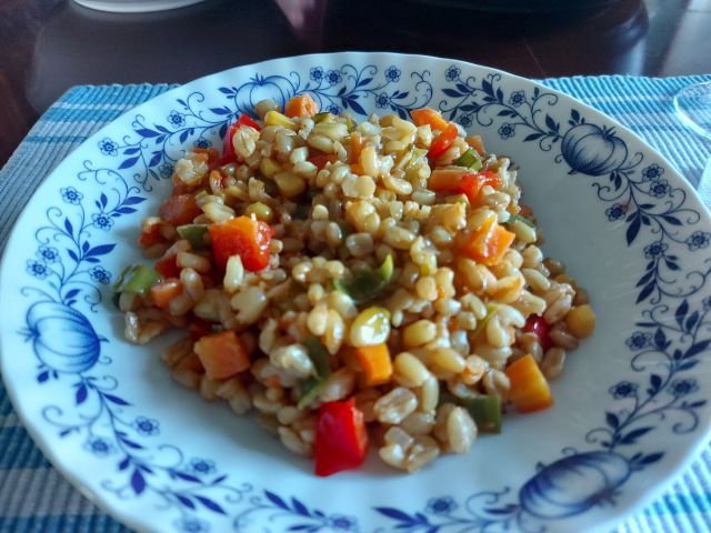 Kamut z zelenjavo je bil prva liga. En dan prej smo imeli enolončnico s kamutom, čičeriko, krompirjem, fižolom in kranjsko (pa z veliko začimb seveda, od česna, peteršilja, origana, dimljene paprike, kumina ...). Ker je precej kamuta ostalo, sem potem najprej popražila čebulo in suhe začimbe, potem dodala narezano zelenjavo, jo le nekajkrat obrnila, da se je samo malo zmehčala, potem pa stresla v ponev kuhan kamut, dodatno začinila in s solato je bilo to eno odlično kosilo.