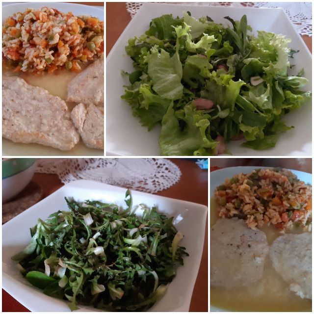 V sredo zelenjavni riž in zrezki, solata, regrat