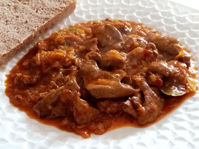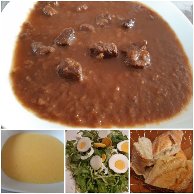 Danes goveji golaž, polenta, kruh, solata
