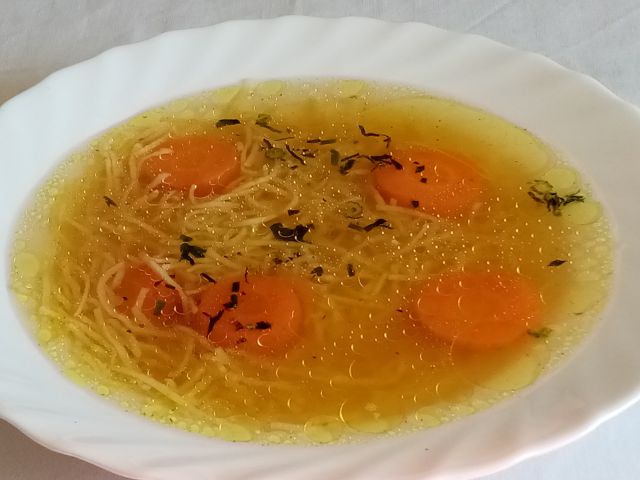 Goveja juha s zvezdicami, pražen krompir, govedina, zeljnata solata, ocvrte jabolčne rezine v pivskem testu brez piva, kava, klopca, sonce