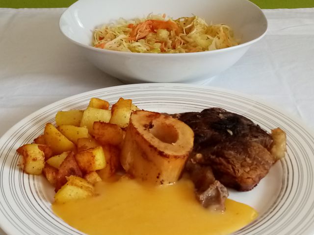 Goveja juhica; osso bučo, popečen krompir, pomarančna omaka; zeljnata solata s korenčkom in krompirjem