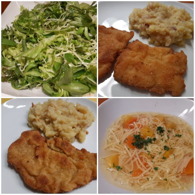Goveja juha z rezanci, pražen krompir, meso na dunajski način, mešana solata
