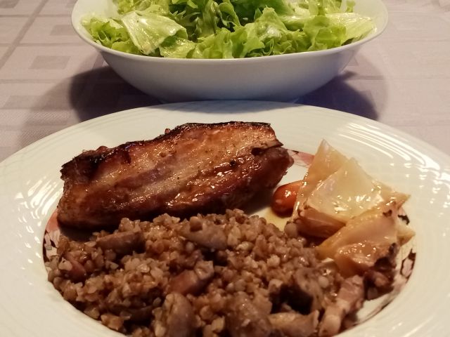 Porovo-zelena juhica; sv. rebra pečena v vrečki, ajdova kaša na slanini in šampinjonih; zelena solata; "plastični" jabolčni zavitek