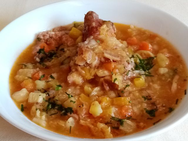 Zelenjavna enolončnica (notri stopila suha pujskova nogica); zlevanka