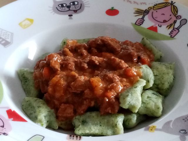 Goveji golaž, zeleni njoki; endivija in zeljnata solata