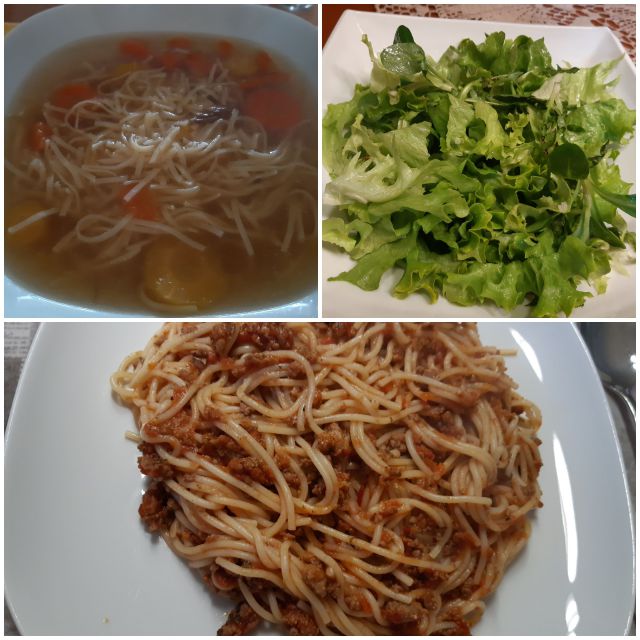 Danes preostanek goveje juhe z rezanci od včeraj, testenine bolognese, solata