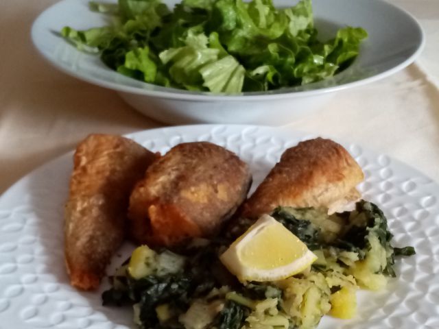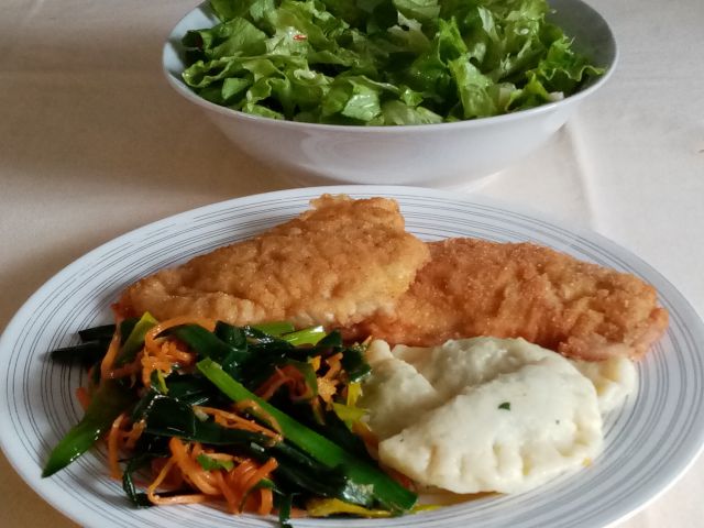Panirani puranji zrezki, mesno-špinačni zvitki, por in korenček na česnu; zelena solata; šarkelj