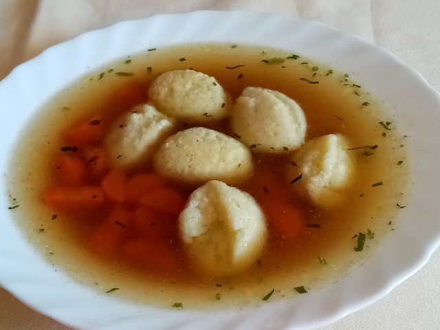 Goveja juhica z zdrobovimi žličniki; nekaj a'la tafelšpic, zeleni pire (krompir/špinača); zelena solata, zeljnata in regrat