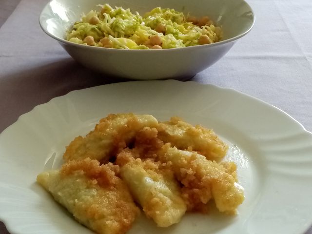 Prežganka juha; nadevani žepki na drobtinah; zeljnata solata s krompirjem in čičeriko
