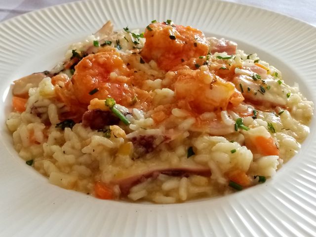 Korenčkova juhica; rižota z lignji, po vrhu še pečene kozice; zeljnata in zelena solata