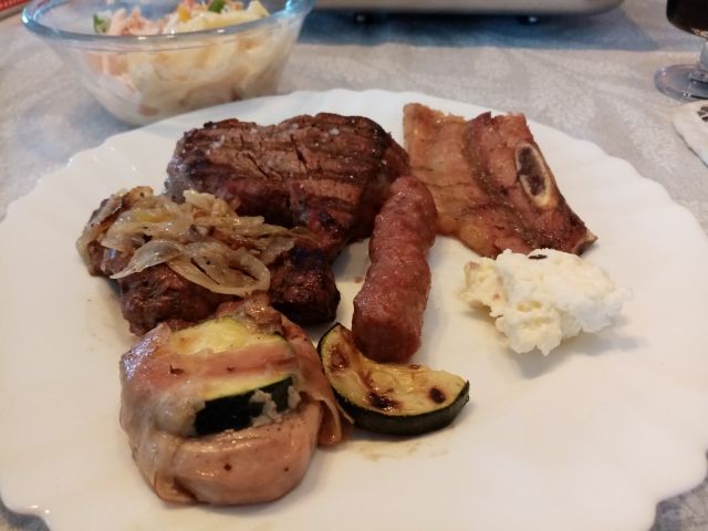 Roštilj, krompirjeva solata, grška solata, pecivo...