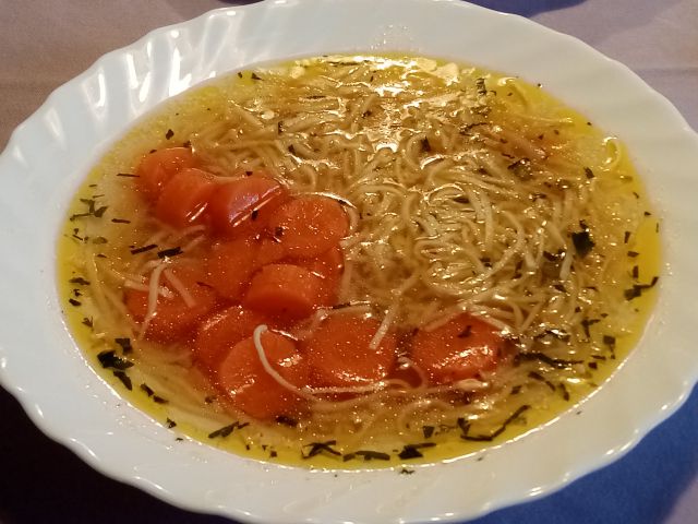 Jutri: goveja juha z rezanci, puranovi in svinjski zrezki v čebulni omaki, pečen
