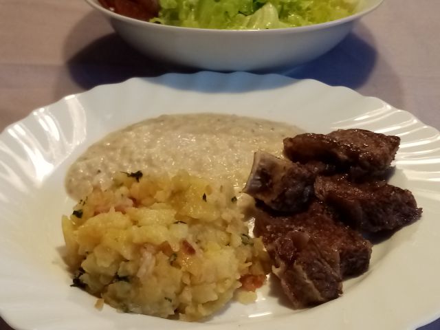 Goveja juhica; popečena g. iz juhe, jabolčno-hrenov zos, pražen krompir; zelena solata / rdeča pesa