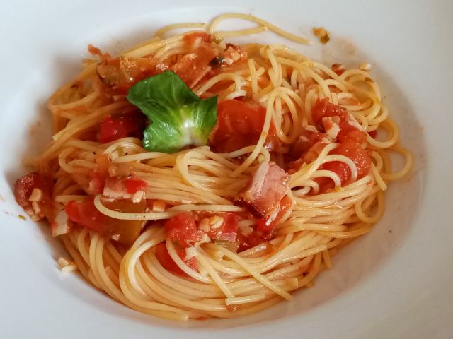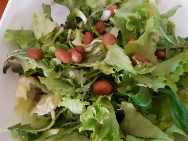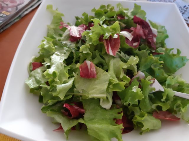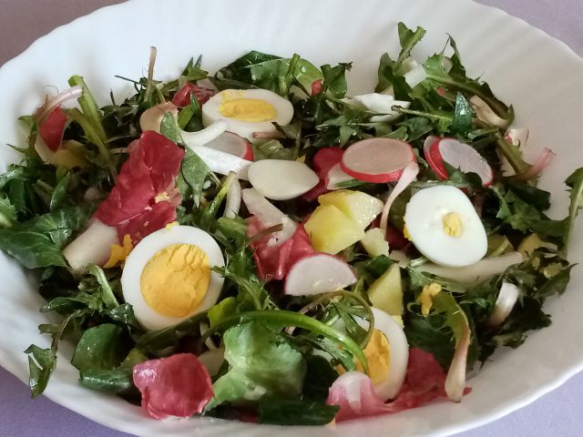 Goveja juhica (od včeraj); špageti s šalšo, česnom, kapri; radič, regrat, krompir, jajček, mlada čebula, rdeča redkev)