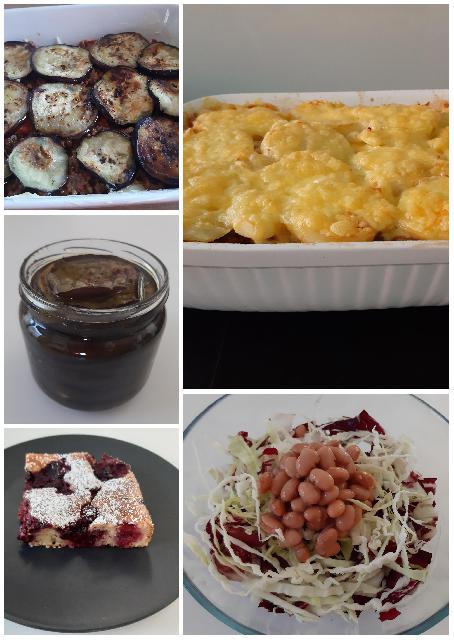 Musaka z mlete govedine in popečenimi jajčevci, mešana solata s fižolom, jogurtovo pecivo z malinami in robidami. Vmes sem vložila še kozarček jajčevcev.