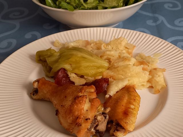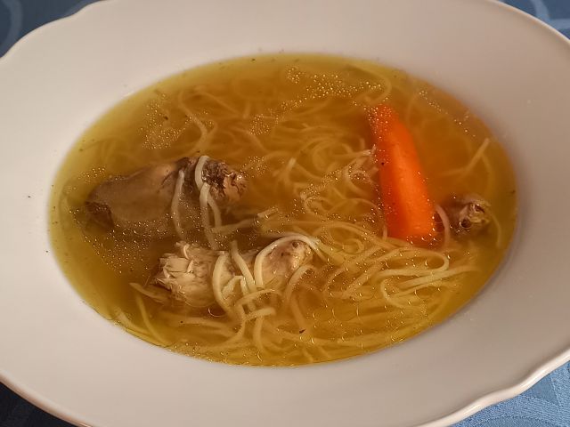 Piščančja juhica z rezanci; na listih želja pečeni piščančji kosi, mlinci; zelena solata