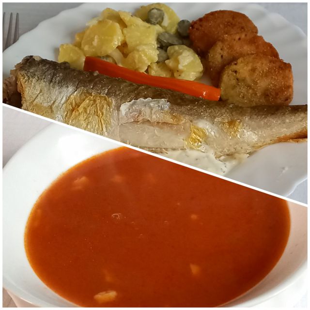 Paradižnikova juhica; pečen oslič, krompirjeva solata, panirani malancani, smetanova omaka s česnom