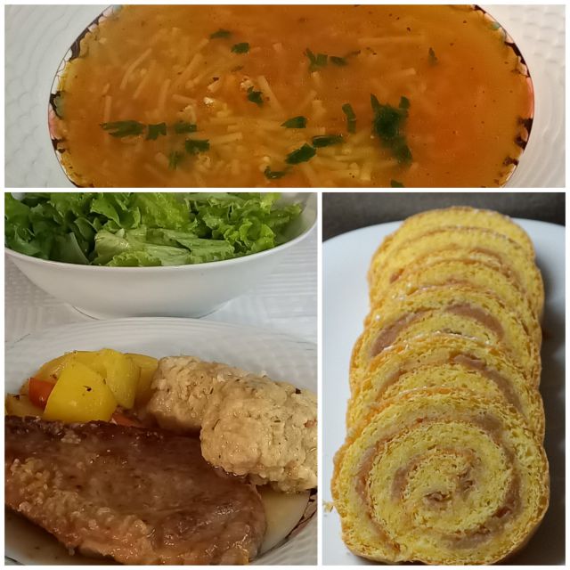 Korenčkova juhica; vratovina in krompir v vinu, kruhovi cmoki; zelena solata; jabolčna rulada