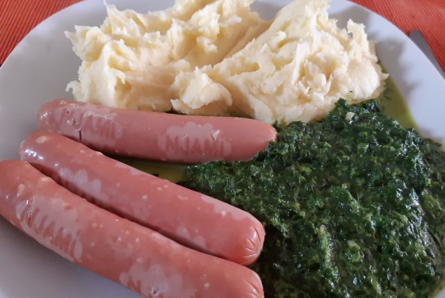 V petek špinača, pire krompir, hrenovke ( različne)