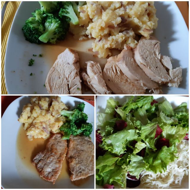 V nedeljo pečena piščančja prsa, zrezek, pražen krompir, brokoli, solata