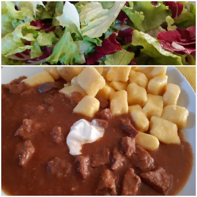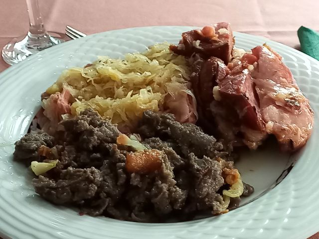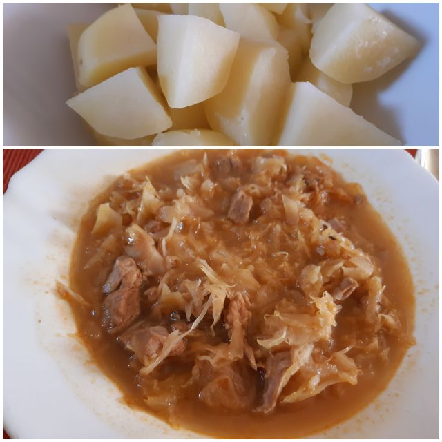 Rusko zelje s kračo, ajdovi žgančki; tortica