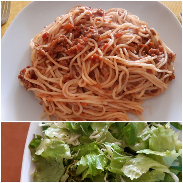Testenine z bolonjsko omako iz zaloge, mešana solata.