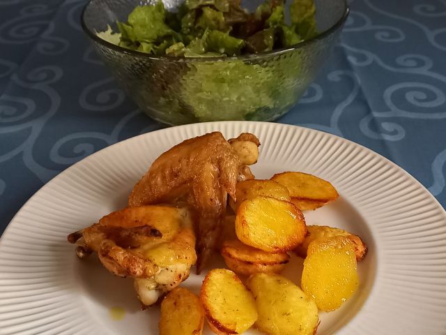 Bučna juhica; pečene perutničke s krompirjem; zelena solata; skutno-jabolčni zavitek