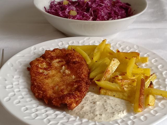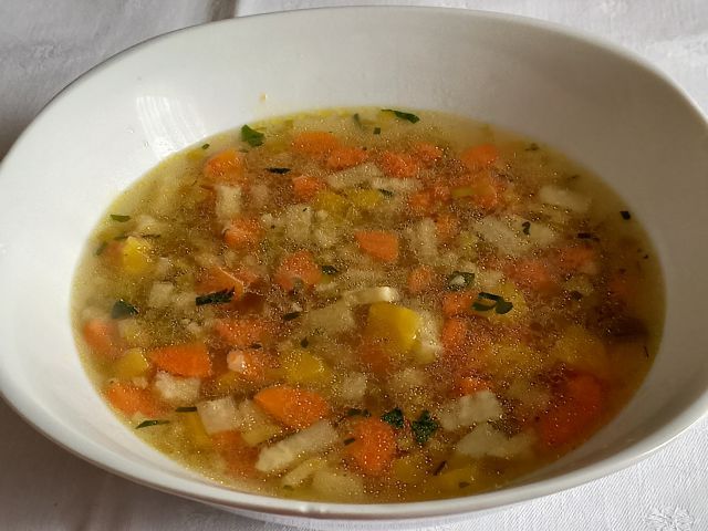 Zelenjavna juhica; paniran pišč. zrezek, krompir; rdeče zelje na solato
