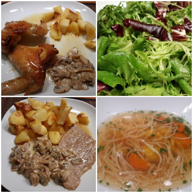 Danes goveja juha iz zaloge, zrezki, piščančje peruti, gobova omaka, pečen krompir, solata z vrta
