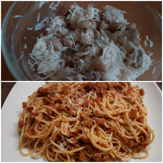 Danes pohod v hrib na sonček, zato pozno kosilo doma. Bolognese omaka iz zaloge s špageti, črna redkev s fižolom.