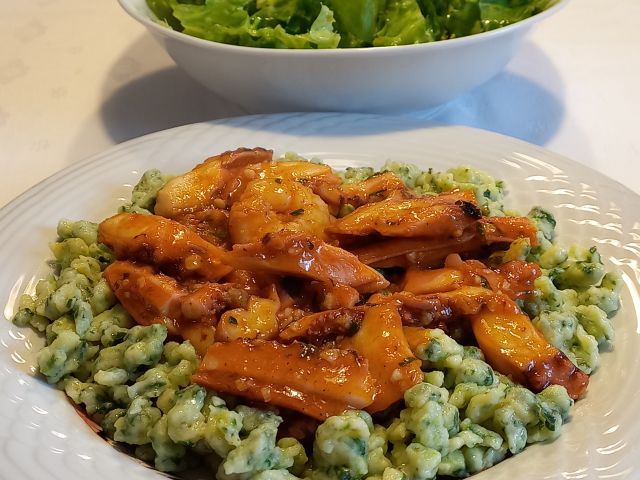Korenčkova juhica; špinačni špecli, "kraki orjaškega lignja" na česnu in vinu; zelena solata