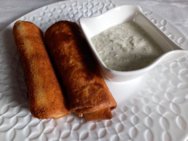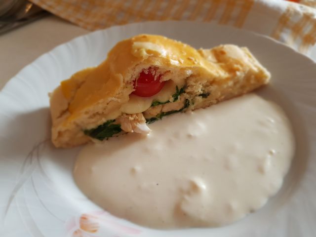 Paradižnikova juhica z rižem; piščančje zavito v tortiljah in pečeno, jogurtno-smetanova omakica, večbarvni radič s krompirjem in jajcem