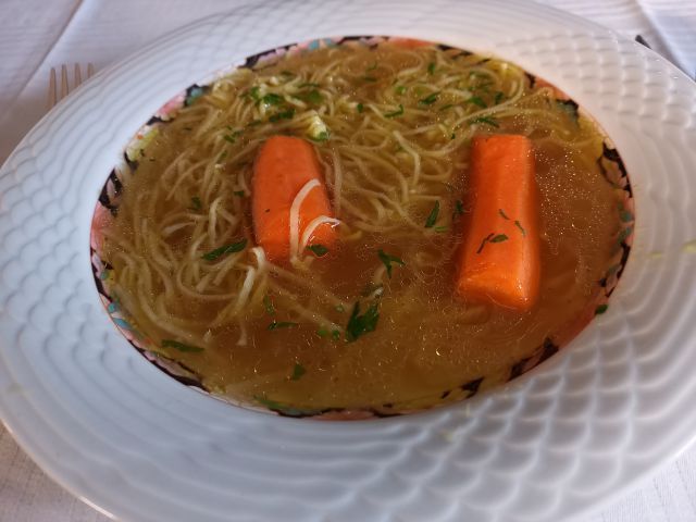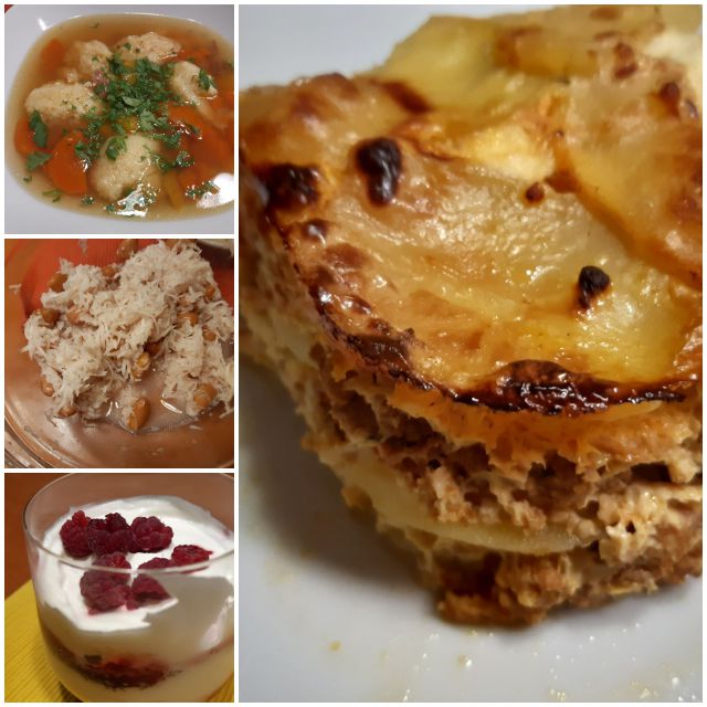 Včeraj goveja juha z zdrobovimi cmoki, musaka, črna redkev s fižolom ... sladica z grškim jogurtom, piškoti, malinami