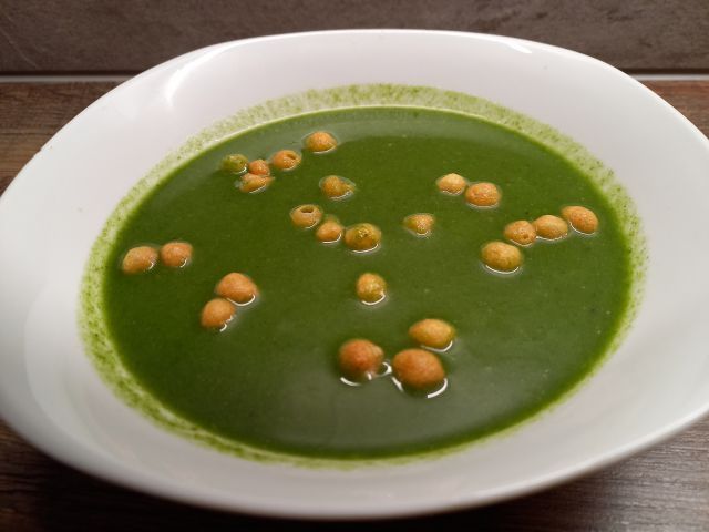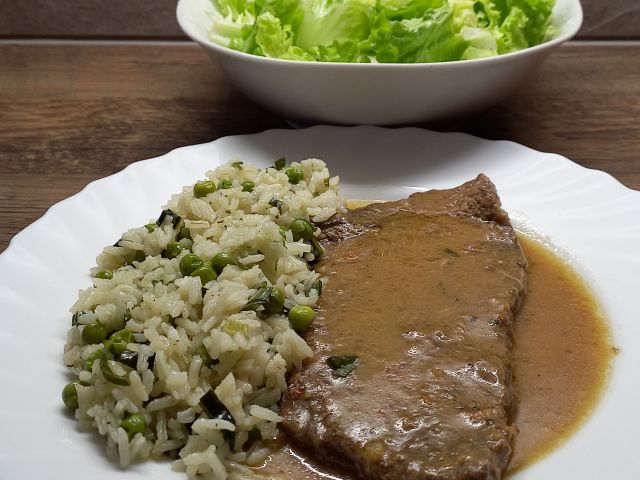 Špinačna juhica; goveji zrezek v naravni omaki, rizi-bizi; zelena solata