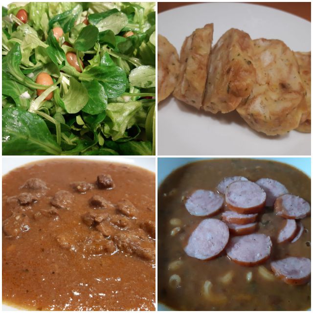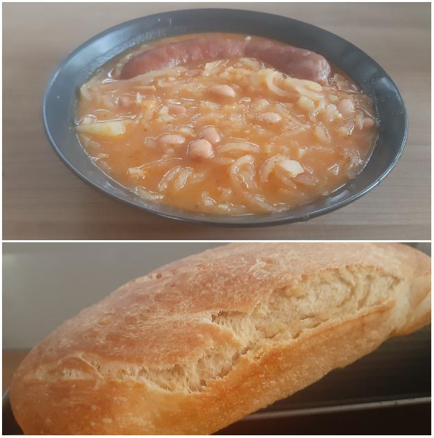 Danes ostanek golaža, kruhove štruce, riž, solata, fižolova juha iz zaloge s klobaso, kruh