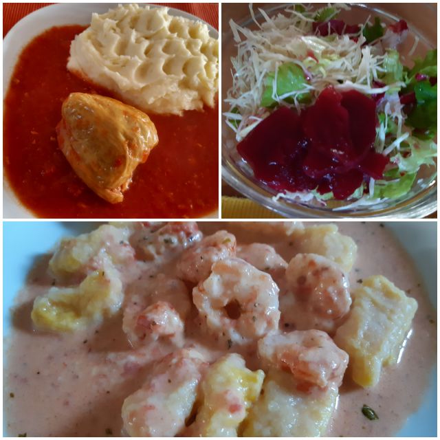 Včeraj kozice v omaki z bučnimi njoki, polnjena paprika s pire krompirjem, solata
