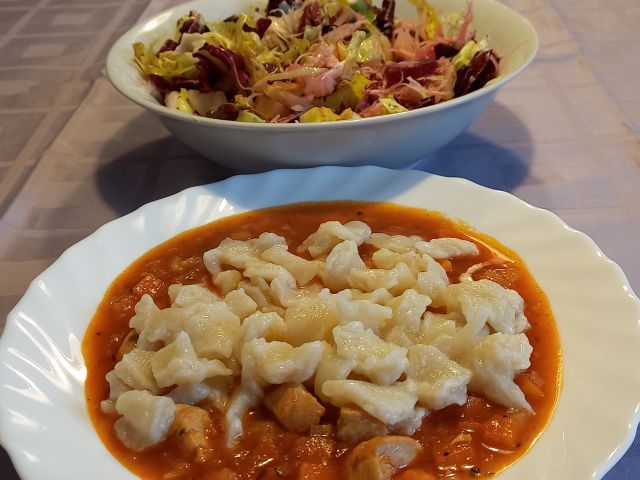 Piščančji paprikaš, ščipanci; radič in zelje s krompirjem na solato