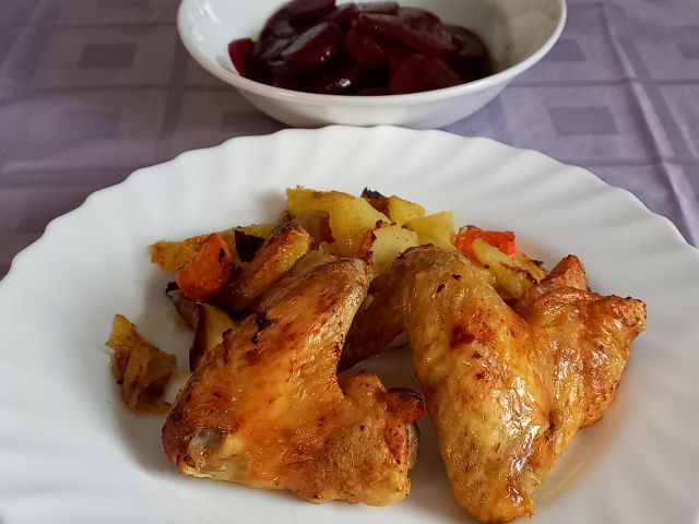 Porovo-korenčkova juhica; pečene perutničke s krompirjem; rdeča pesa
