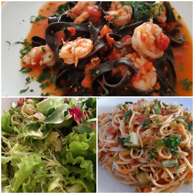 Včeraj kozice s sipinimi rezanci zame, za moja dva špageti z zelenjavno omako, solata