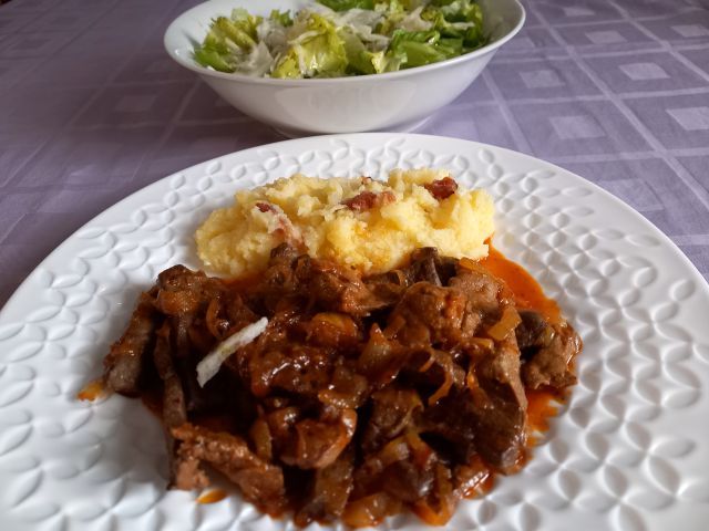 Pražena jetrca, polenta z ocvirki; endivija z naribano redkvico