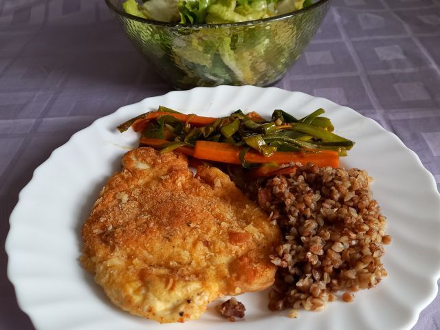 Goveja juhica (iz zaloge), ajdova kaša na slanini, piščančje panirano, korenček in por iz voka; endivija