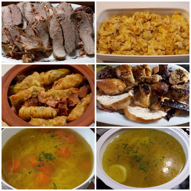Goveje/kurja juhica z rezanci in grez knedlčki; telečja pečenka, nadevan piščanec, mlinci, rizi-bizi; sarma; zelena solata, zeljnata solata