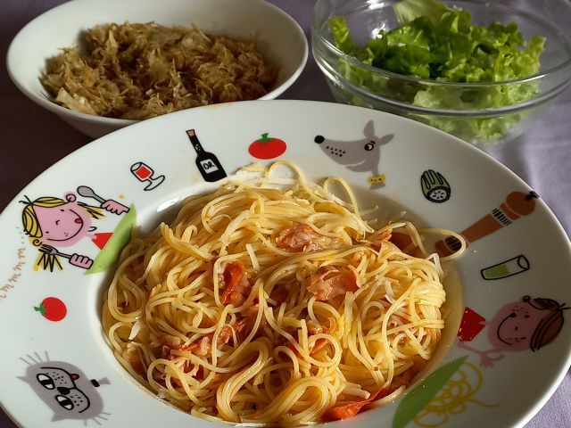 Špageti na pršutu, česnu in olivnem olju; kislo zelje s česnom in bučnim oljem; zelena solata