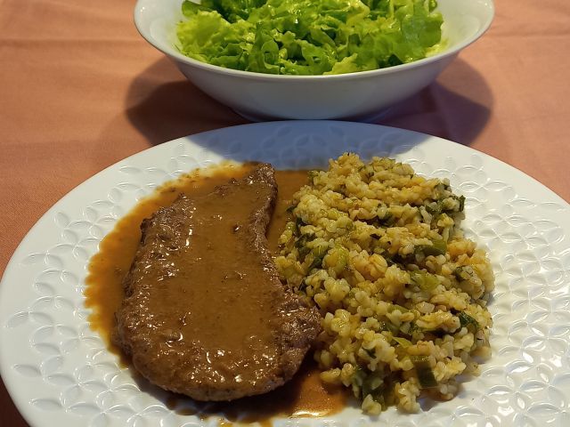 Goveji zrezek v naravni omaki, bulgur na poru, zelena solata